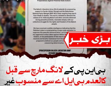 مانیٹرنگ ڈیسک کالعدم بلوچ لبریشن آرمی (بی ایل اے) سے منسوب ایک غیر مصدقہ بیان جمعہ کی رات دیر گئے سوشل میڈیا پر سامنے آیا، جسے مبینہ طور پر گمنام ڈیجیٹل آپریٹیوز سے منسلک اکاؤنٹس کے ذریعے شیئر کیا گیا۔ مزید پڑھیں